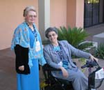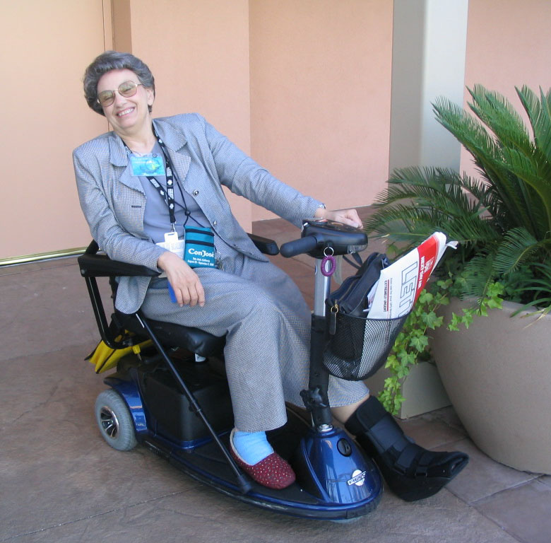 See erudite comments concerning It didn't work, but some other people in scooters thought it was a good idea. I remember sitting alone in my room the first few minutes staring at the scooter and trying to figure out how I could possibly transport all my flyers. They'd SAID the thing had a basket -- but it was about 9 inches wide tapering to about 7 and barely held my purse. Then my husband who had the adjoining room opened the door and brought me my yellow dispatch case with the Sime Girl on it, and I remembered KAREN!!! I hitched it onto the back of the scooter chair and it hung perfectly and I was able to reach behind me and produce just the right flyer by feel, if I packed it right each morning. I remember all the help necessary to get doors into restrooms opened to get in and out of the handicapped access restroom! Yeah, right -- but then I'd been warned about that and noticed it before. I remember the restrooms Jean found where you could scoot straight into the stall and straight out again -- and how Jean taught me to get in and out of an elevator. Hanging out with Karen has paid off BIG TIME at this convention even though she wasn't there -- she was there in technique after technique she taught me. I remember how the nice extra-wide door on the bathroom in our room opened out and hit the corridor door with a crash I couldn't prevent while hobbling. I couldn't see how to get the scooter in and out of the bathroom though the door was wide enough, the turn was way too sharp and the hall too narrow -- but you can't do that anyway because the directions say NO WATER by the battery driven scooter. Oh, and the whirr the charger makes while you're thinking to go to sleep. I remember how in the airports total strangers would come give me a push when I hijacked the wheelchair (that lacked handle-rims on the wheels so you had to propel it by the tires) to go to the restroom. Oh, and after all the bizarre trials of traveling unable to walk, I remember arriving at John Wayne Airport to find my favorite suitcase which I paid extra for because it's made of indestructible top grade ballistic nylon had been ripped to shreds and the frame bent. The airline routinely replaced it with one of a totally different design -- cheap looking, too -- which is totally unusable for either me or my husband (darn thing is almost as tall as he is!). Finally, yesterday I got a call that they're sending a new one from the company I use ( tutto.com ) which is for bad backs and the best luggage I've ever had. HOWEVER they no longer make the suitcase that was destroyed -- I have one of the replacements and it's shorter and thicker even though it may hold the same volume or more. The one that was destroyed was thin and flat and large enough to carry one of those large posters we sometimes take to cons, or other demo materials I generally carry. So I will now have two of the thicker pullman cases. I remember long conversations with Torun -- what a fabulous woman! I remember the Sime~Gen party, the heartfelt tribute to Shirley Maiewski, long time head of the Star Trek Welcommittee. Everyone loved the bubbly apple juice we toasted with, and Kaires brought around a berry drink she'd made that she'll tell you about (RECIPE PLEASE!) which was marvelous and non-alcoholic. I had a long conversation with Ed Wilson, and a whole bunch of people dropped by to say hello -- coming to the hotel just for the Sime~Gen party, but not buying a membership to the con. I had several long conversations with them that I'll let them tell you about in their con reports. Meanwhile, Jean was popping up every once in a while to run the door-prize drawing. I had brought some books for prizes, and our co-hosts EPIC and BROAD UNIVERSE brought items -- Joel Davis brought a whole lot of stuff about Welcommittee and Shirley, and gave me a set of photos to die for. Kaires engineered this extravaganza -- there was food galore, Welcommittee and Sime~Gen decorations, and I didn't even see everything! Cherri Muñoz, who now lives in Mexico temporarily, turned up and helped set up the food for everyone. She was a delight throughout the whole con even though she was favoring an arm she wrecked moving to Mexico. I heard the next morning that when he left our party to go party-hopping, Joel fell and broke HIS ankle and got himself booted in an emergency room. He's in worse shape than me because he's living alone in a walk-up, and I have a flat house. I also have my husband who has been doing everything for me. So my greatest sympathies go out to Joel!!! I remember Saturday afternoon, after I'd had a chance to read the printouts Ed Wilson brought me, Ed came up to my room where I was seated with my feet above my shoulders hoping the swelling would subside (which it did and does, but then comes back) and we had a marvelous conversation about what he's been writing lately while Jean nibbled nuts and got ready for her next panel. I think Torun turned up shortly after that -- I basically had an all-day con in my room while I kept my feet up and hoped I'd last through the trip home on Monday (hopes fulfilled; I lasted but I'm still in crash-mode, with no energy and no stamina at all.) I remember my husband brought me new ACE bandages almost every day -- searching for some variety that would work better. And believe it or not, I remember a few of the panels -- at least flashes of comments here and there. But it's sort of a blur which comments were discussed under which topics. I had a blast on each of the panels -- would get so involved in the topics that I actually and really totally forgot how much my ankles hurt. I just didn't feel any pain during those hours -- but I paid for that at the end of the day! I must have done something right though because after each panel people came and scarfed up bunches of flyers. Maybe some of them are lurking on this List now and we might hear from them eventually. Sunday night Jean, Katie Steinhoff and I took some time to go out to