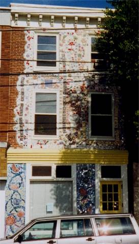 Isaiah Zagar makes mosaics of mirror and potter and colored stucco. This is the Physicians for Social Responsibility Building.